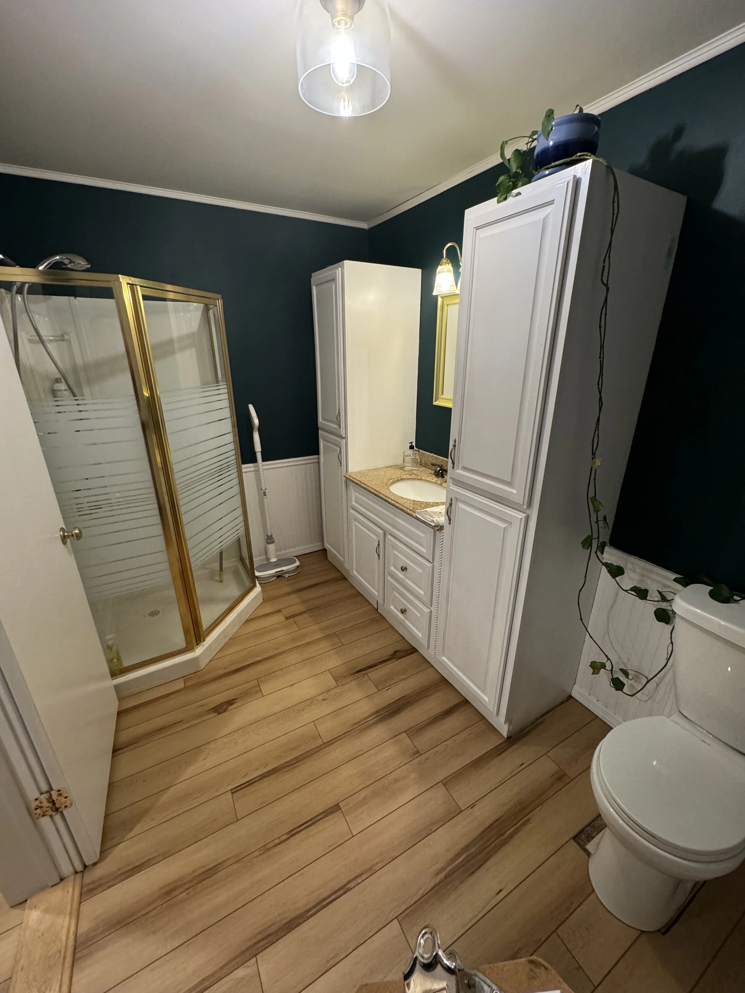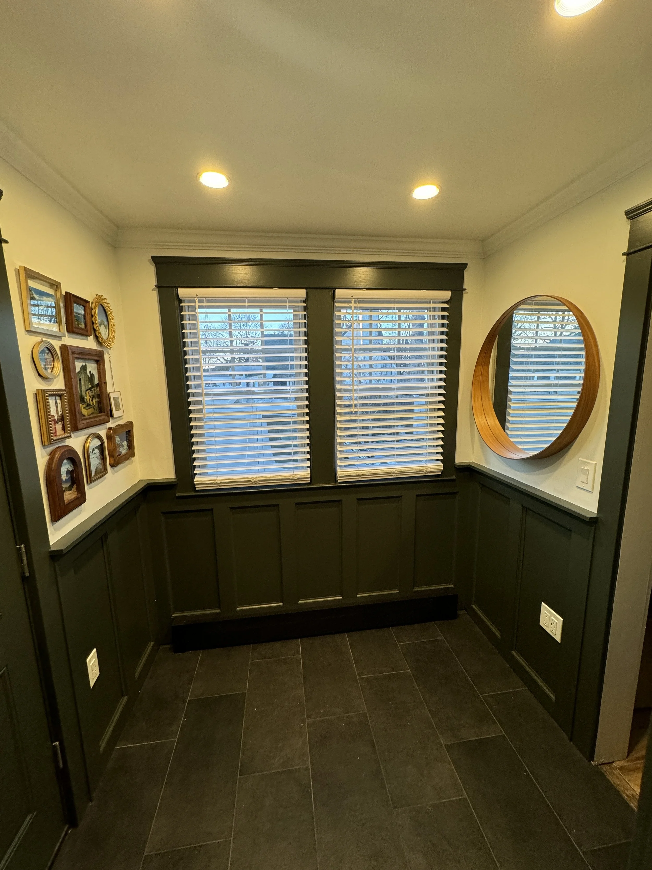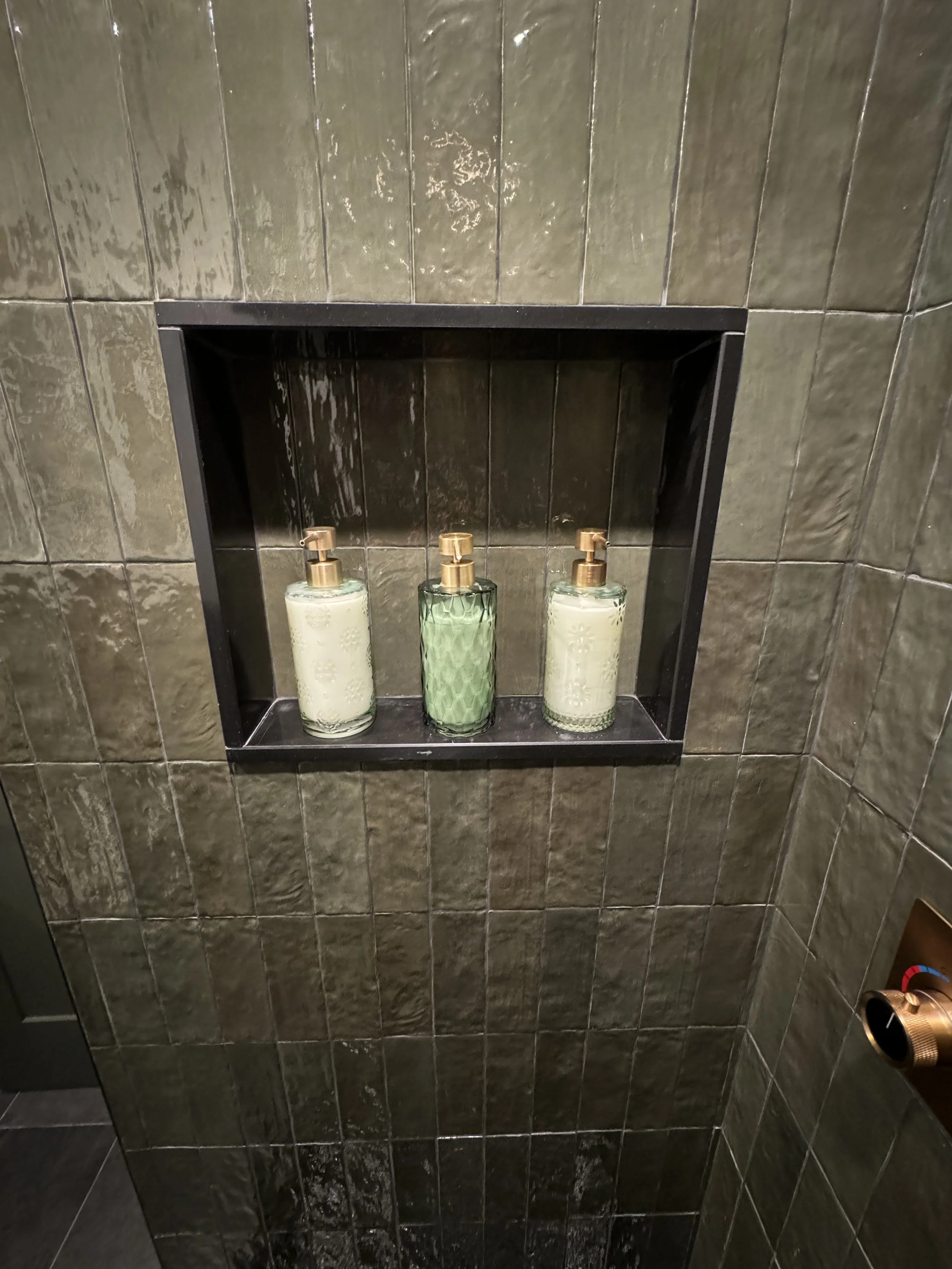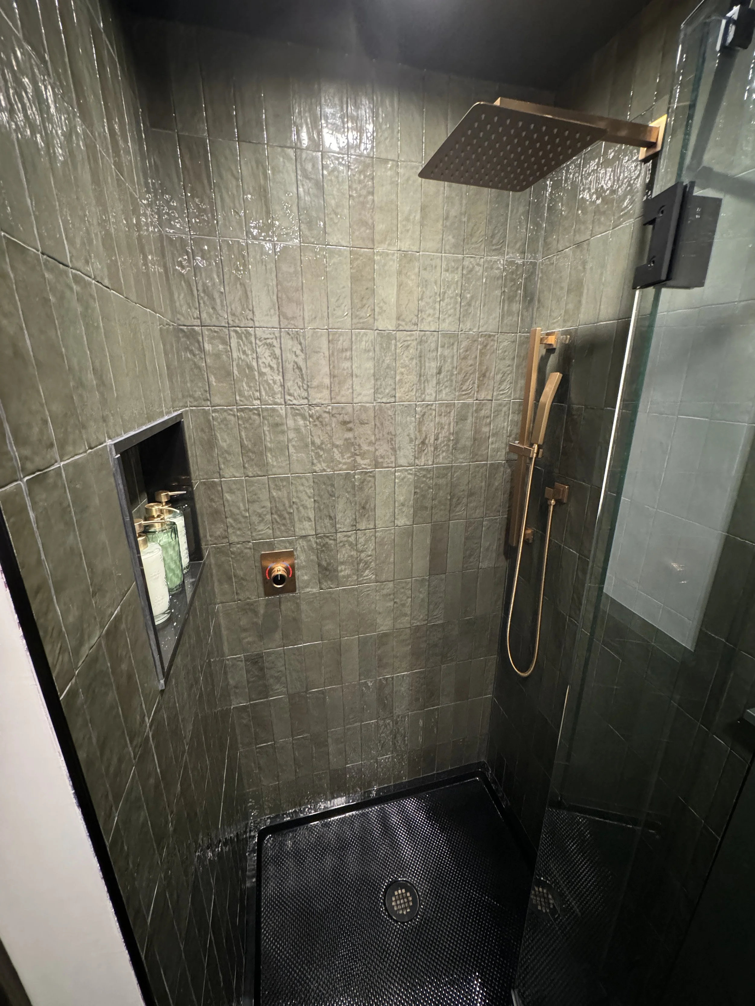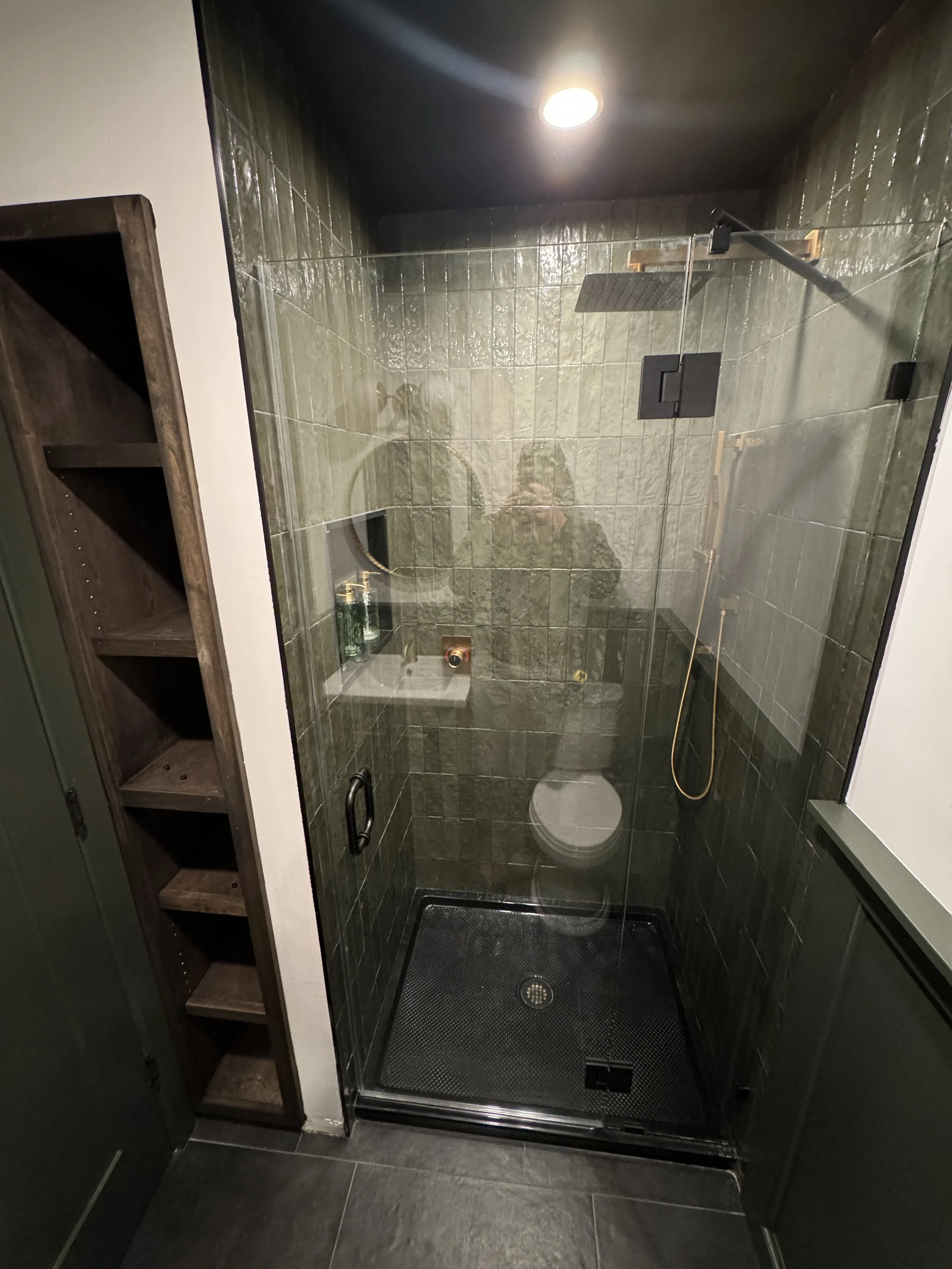 Inside the bathroom, classic meets bold: a unique black shower pan paired with rich green subway tile sets the tone for a moody, timeless vibe. Custom wainscoting and craftsman-style trim tie the space together with elegant detail.
